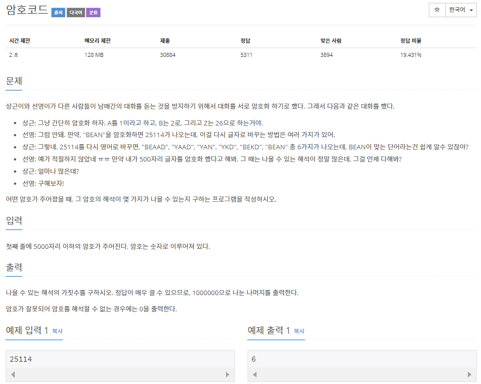 25114 같은 숫자에서 각 자리수 또는 두 자리수를 알파벳으로 치환시켜 암호를 해독하는 문제이다.